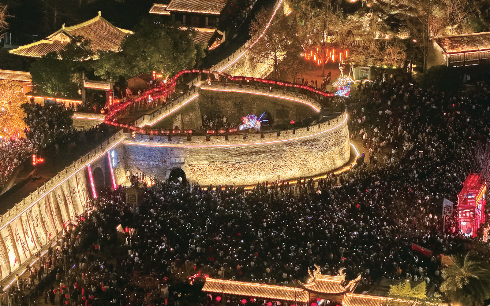 正月十四闹元宵是临海的民俗传统。当晚,大田板龙、黄沙狮子、大石车灯戏等节目轮番亮相台州府城,营造了浓浓的节日氛围。图为大田板龙在兴善门瓮城表演。 周继宗摄