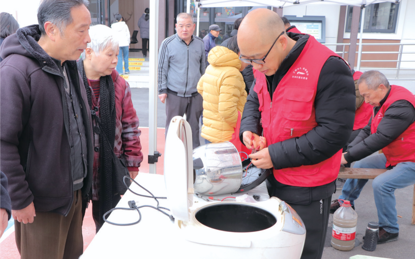 活动现场开设志愿服务集市,志愿者们为广大市民提供理发、磨刀、维修、手机贴膜等便民服务,并开展反诈宣传。图为志愿者为市民维修家电。
